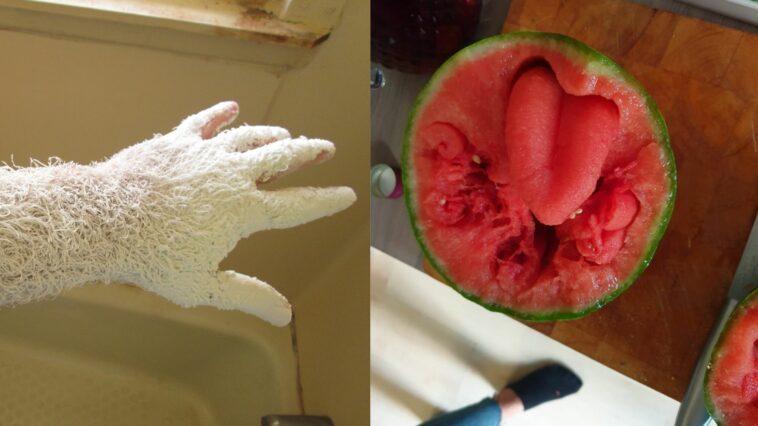 Vypadá to, jako by tento jazyk na půlce melounu někdo šikovně vyřezal nebo vykrájel, skutečnost je však taková, že meloun explodoval při pokusu o rozříznutí.