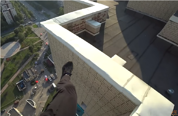 Na videu můžeme vidět, jak kráčí po okraji římsy velmi vysoké budovy, skáče z jednoho rohu na druhý až do momentu, než se děsivě zaplete do něčeho, co vypadá jako elektrické dráty. A právě tyto dráty, jeho pohotové reflexy a přítomný kamarád, mu ve finále zachrání život.