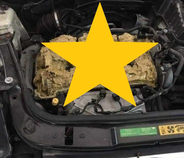 Po otevření kapoty se ukázalo, že motor je pokrytý lepkavou hnědou látkou, která vycházela i zpod auta, což proměnilo motorový prostor v katastrofu. Jak se později ukázalo, řidička omylem nalila kapalinu do ostřikovačů do olejové vany místo té správné nádobky.
