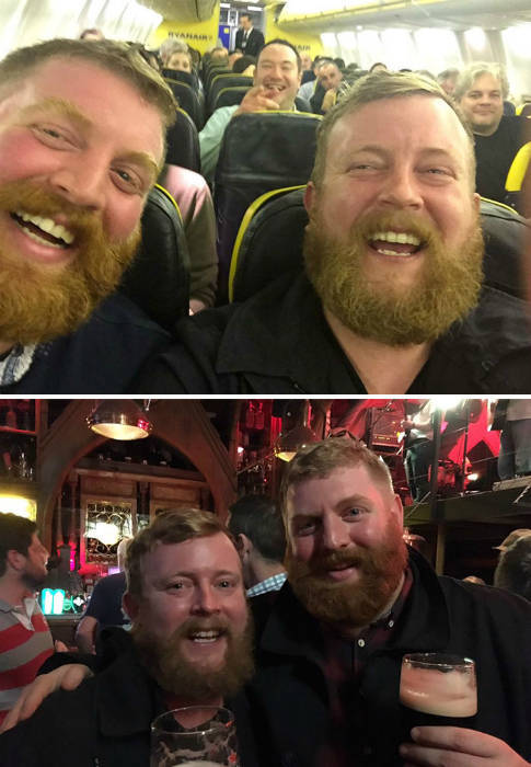 Někam letíte a najednou se díváte do zrcadla. Cože? Ne, to je jen člověk, který vypadá úplně stejně jako vy. Všimněte si lidí okolo, kteří projevují společnost radost a nadšení. Spodní fotka je z party, na kterou po letu šli.