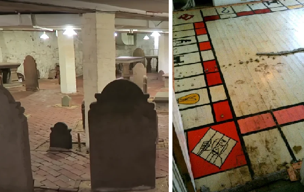 3. Nedotčený hřbitov z roku 1800 zachovaný v suterénu vysoké budovy postavené nad ním.