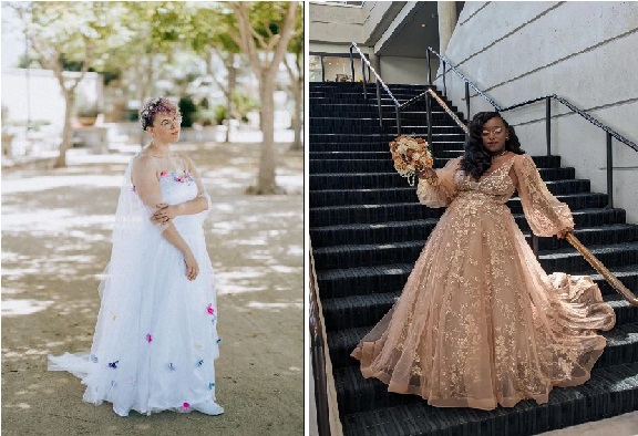 Ušila si své vícebarevné květinové svatební šaty. Ručně na ně přišila stovky květin na 3 ze 6 vrstev kruhové sukně.